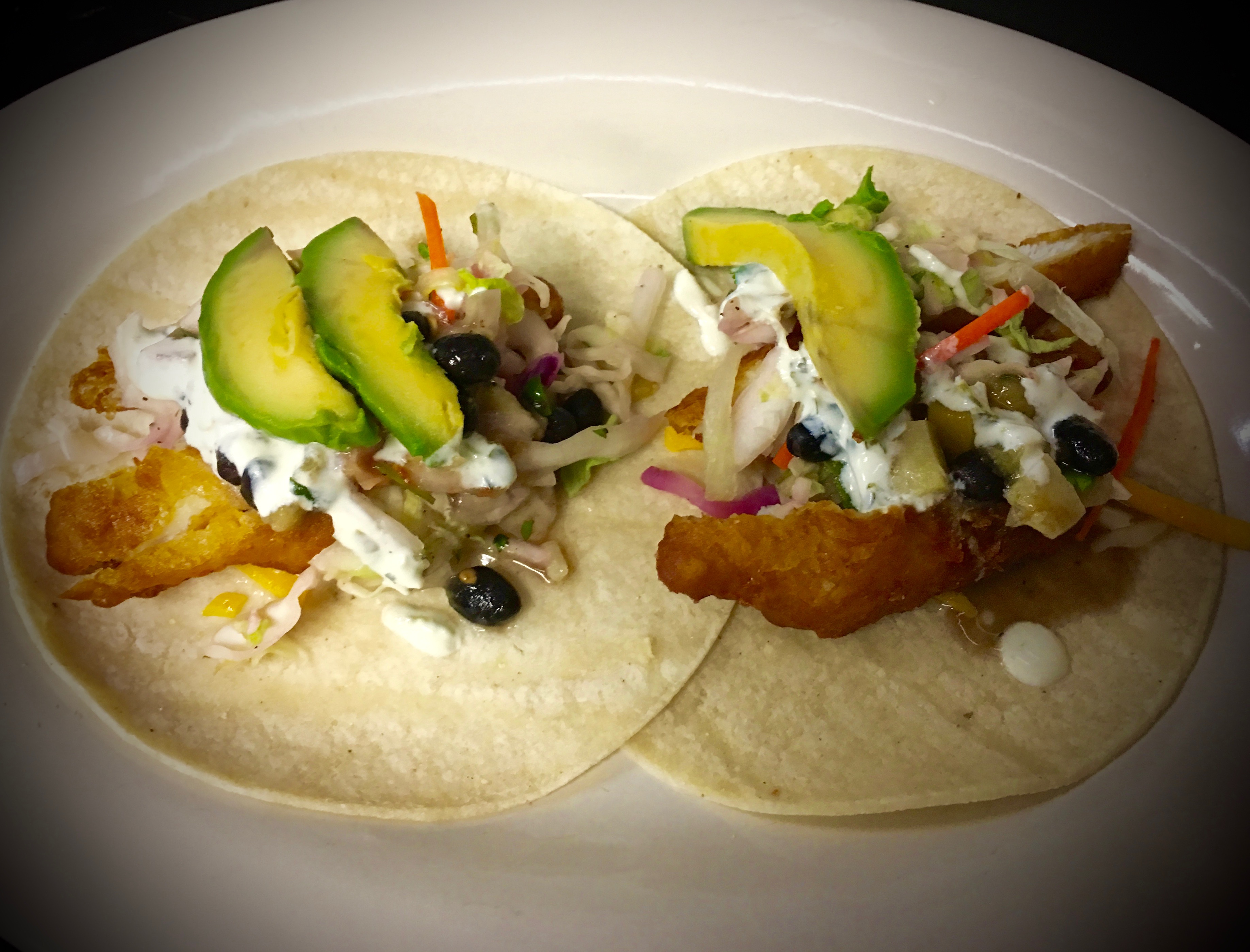 Tacos stuffed with lettuce, tomato and fried cod lightly drizzled with chipotle mayo and topped with pineapple sauce.