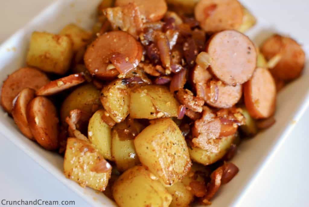 Add sliced smoked sausages to the large bowl. Hillshire farm® smoked sausage and potatoes meet fresh vegetables in a hot skillet in this smoked sausage and potato skillet recipe. Put oil in the pan and add the chopped onions and garlic. Smoked sausage potato casserole kitchen gidget. Cut red onion, bell pepper, and potatoes into the size you want.
